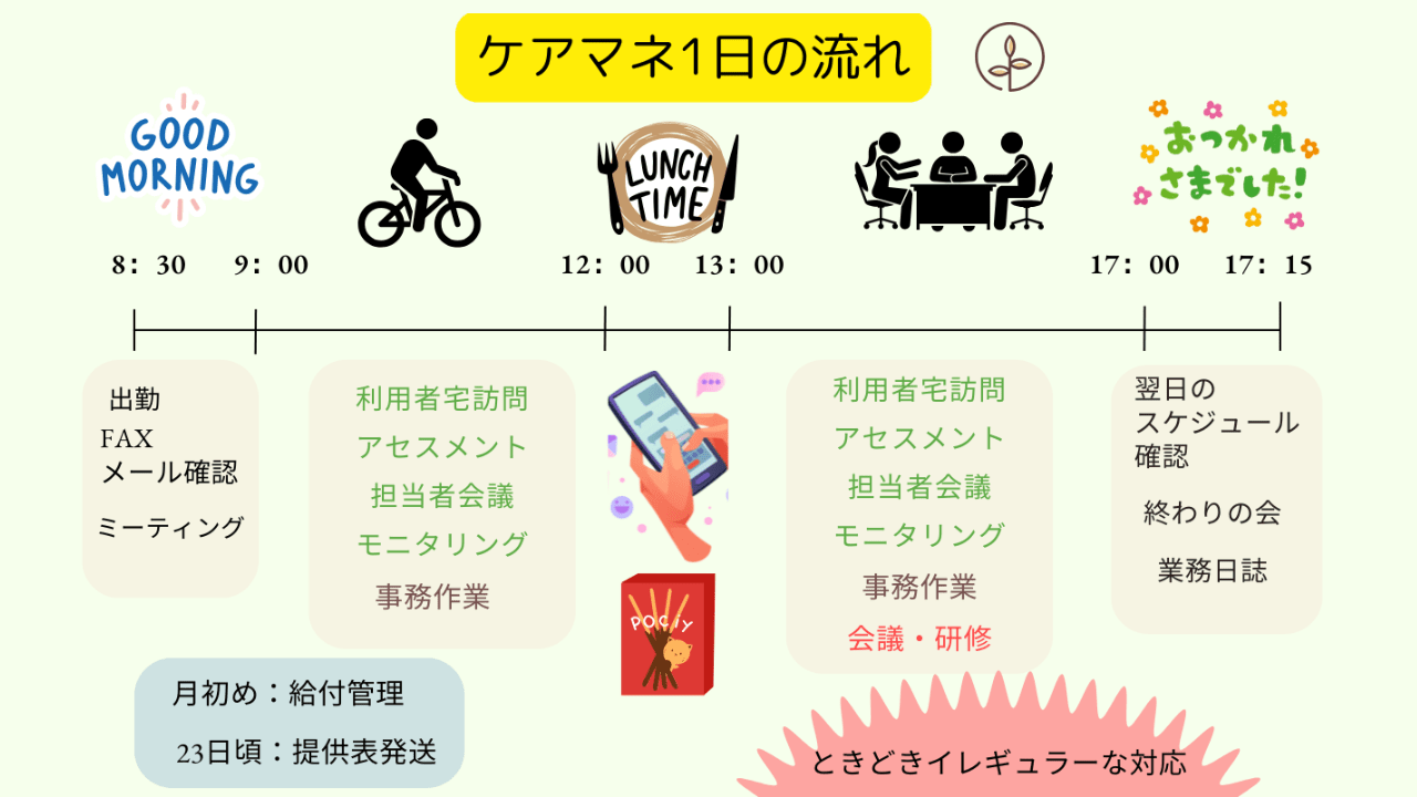 今回は、”ケアマネジャーのリアルな1日の仕事の流れ”を紹介しました。