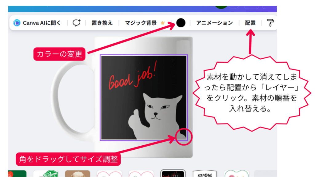 使いたい素材があればクリック。マグカップの上に素材が配置されます。