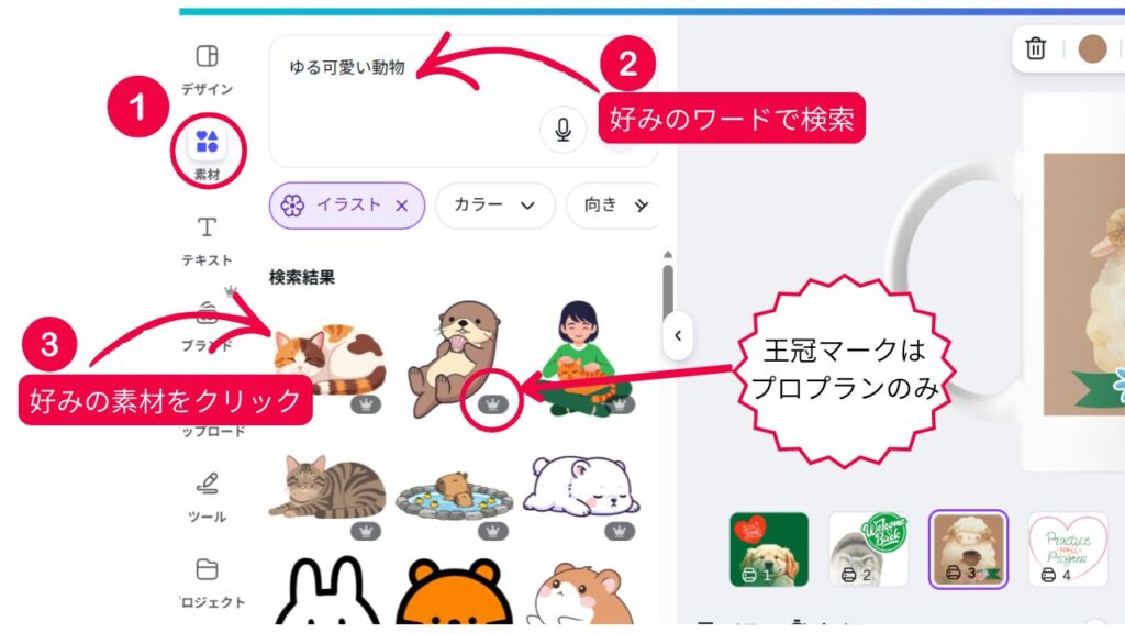 素材の右下に王冠マークがついているものは、Canvaプロプランで有料です。
