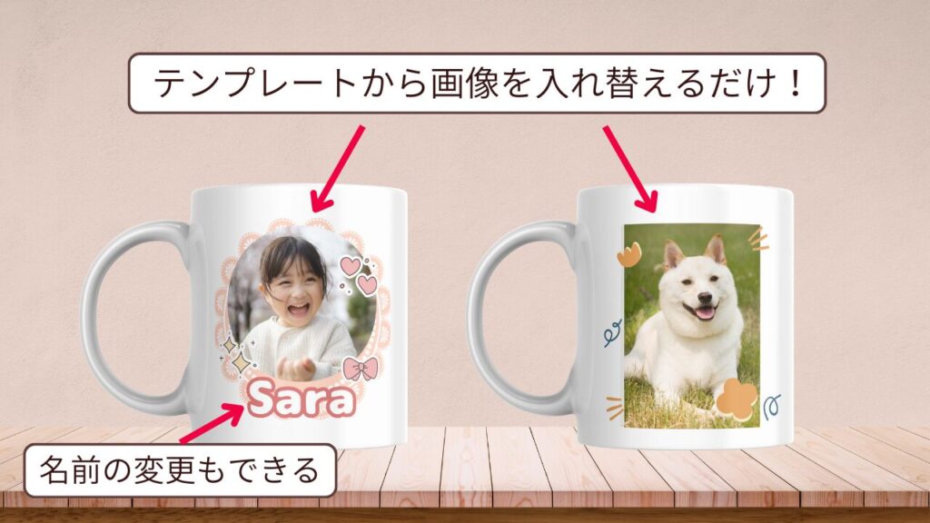 ここまでは、イラスト素材を使ったデザインを紹介しましたが、自分の子供やペットの写真を使って、マグカップを作ることもできます。