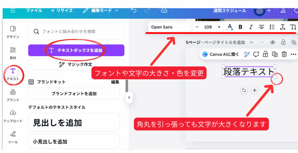 文字入力は左メニューの「T テキスト」をクリックして、「テキストボックスを追加」